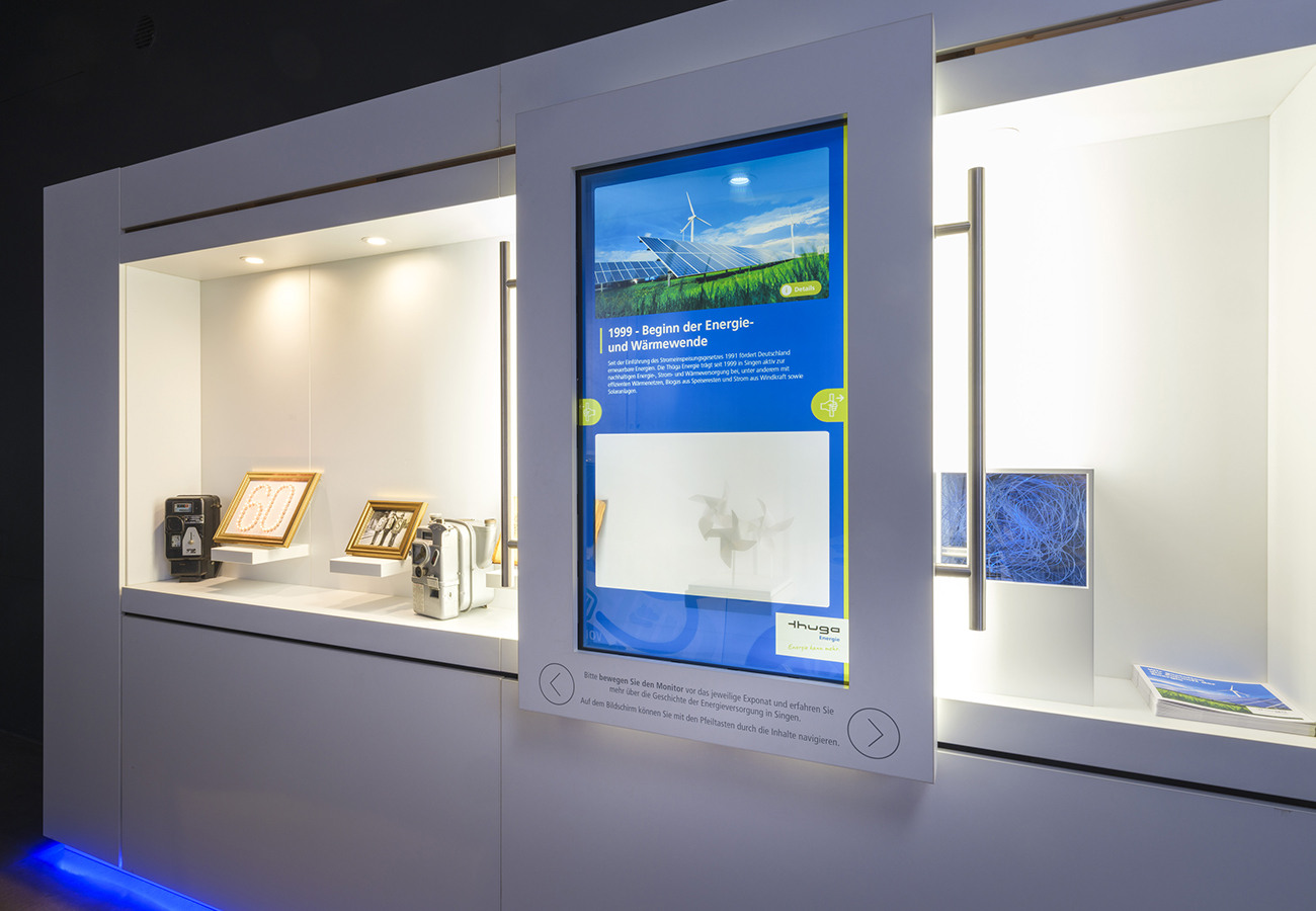 Ein Highlight der Ausstellung ist ein interaktives Exponat zur Singener Energiegeschichte. Es lädt Besucherinnen und Besucher zu einer Zeitreise durch über 100 Jahre Energieversorgung ein. Auf einem beweglichen Monitor kann die Entwicklung von Elektrifizierung, Gas- und Erdgasversorgung bis zu heutigen CO₂-neutralen Lösungen verfolgt werden.