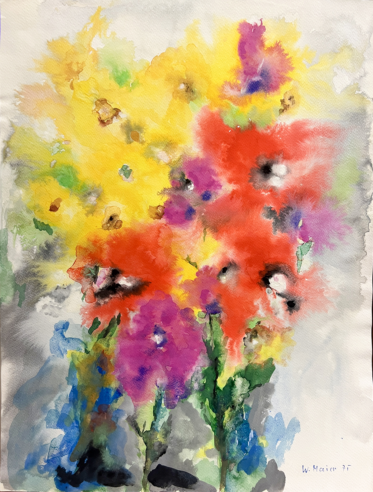 Waldemar Maier, 1913 in Singen geboren, als Beamter und später selbständiger Kaufmann tätig, wendet sich ab 1972 verstärkt der Malerei zu. Frühen Anstoß zur Kunst erfährt er bereits durch seinen Zeichenlehrer am Gymnasium, Franz Ziegelmüller, der ihm in späteren Jahren auch Privatunterricht erteilt. Maier, der sich autodidaktisch der Kunst nähert, orientiert sich vornehmlich an der expressionistischen Formensprache wie sie die Kunst vor und nach dem ersten Weltkrieg bestimmte. Locker gesetzte, stark farbige Flächen akzentuieren.