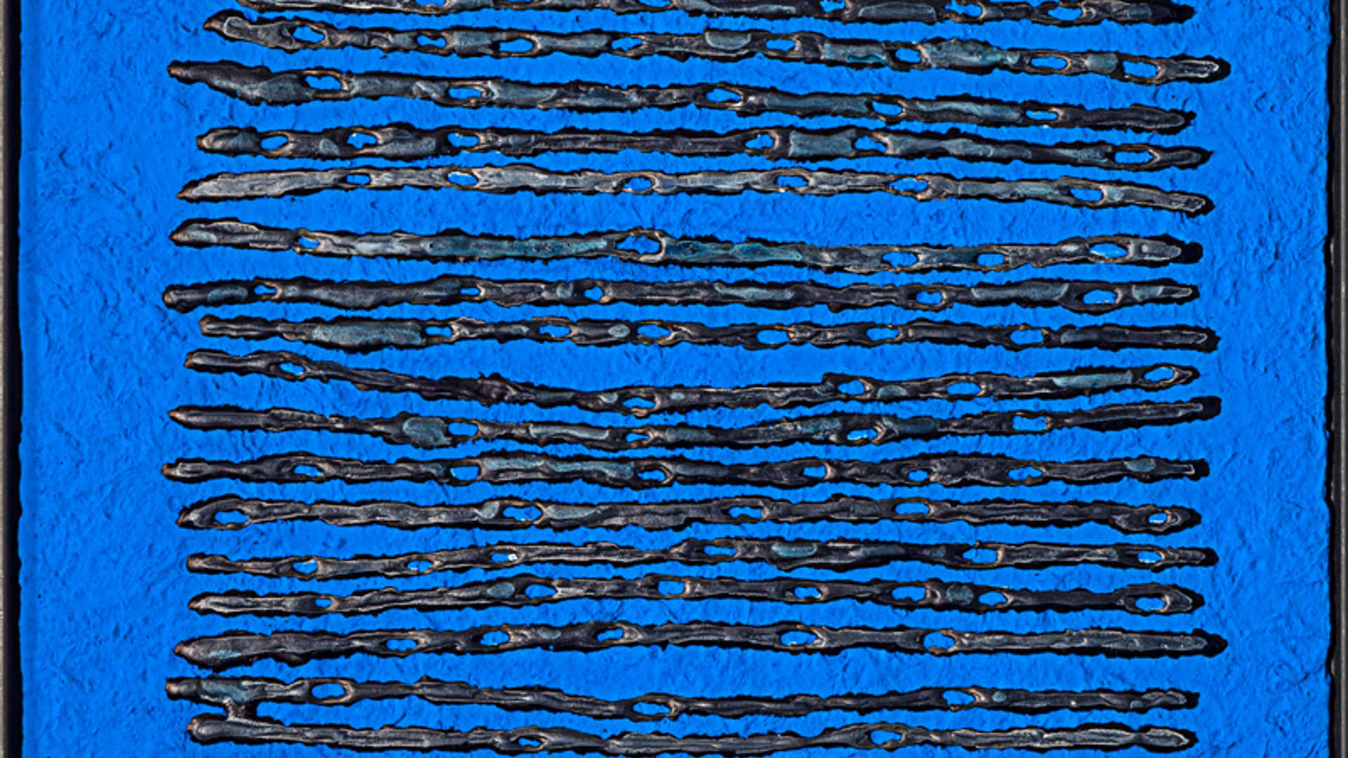 Andere Künstler folgten. Der Franzose Yves Klein – Sabine Becker kannte ihn nicht, als sie die weite blaue Welt für sich entdeckte – wählte für sein monochromes Universum Ultramarin. (…) Der Hyperaktive führte die Entleerung des Bildes über die Monochromie hinaus fort bis zur vollkommenen Auslöschung sensueller Erfahrung. Ein radikaler Ansatz – aber das ist eine andere Geschichte. Er führt weg von Sabine Beckers monochromen, neuerdings von wellenartigen Linien, von Gittern oder von Bomben-trichter ähnelnden „Inseln“ durchzogenen Vorschlägen, die – im Unterschied zu Yves Klein – den Betrachter bewusst in den blauen Farbraum ziehen. (…)